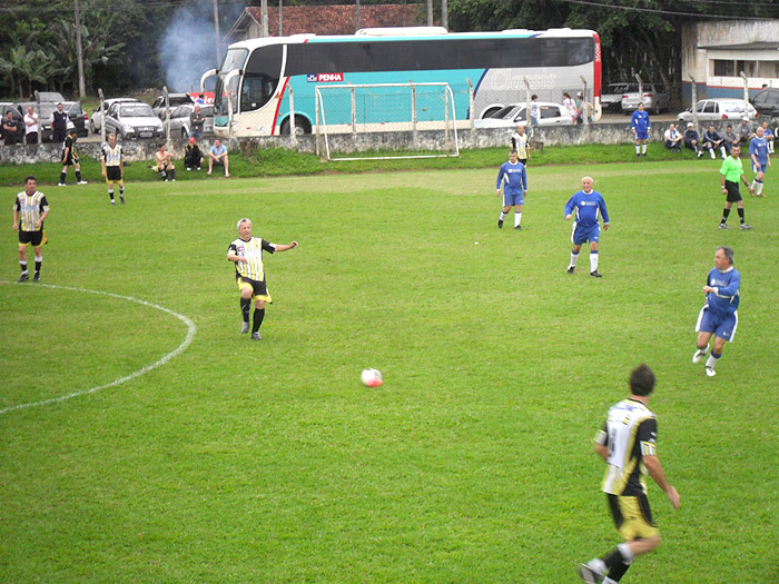 O Veteranos Nova Aurora de Blumenau recebeu nesse fim de semana a visita dos Hermanos Uruguaios, que vieram retribuir a visita feita no mês passado a capital Montevidéu. Apesar de todo o cansaço da viagem, já que por conta de um problema técnico com a agência de turismo contratada algum tempo atrás (quebrou), não conseguiram remanejamento para outras empresas aéreas, tendo que viajar de ônibus até Porto Alegre e de lá pegaram um vôo até Floripa, chegando às 11 horas de sábado. Depois seguiram de ônibus novamente até Baln. Camboriú onde ficaram hospedados, depois novamente ônibus até Blumenau para jogar às 16:30hrs. Imaginem a canseira! Os hermanos jogaram muito bem, mostrando que tem uma equipe máster bastante qualificada, jogadores com habilidade e bom domínio de bola e um goleiro veteranão muito bom, fazendo boas defesas, mostrando que ainda está em plena forma. Me impressionou muito! Fazendo o jogo ficar equilibrado, o placar magro mostra bem isso. A equipe do Nova Aurora jogou bem como de costume, já é uma equipe com 40 anos de existência e bem resolvida, entrosada por natureza, que conta com jogadores que vem de gerações anteriores, coisa de pai para filho e logo de filho para neto, formando uma grande família. Como era um jogo festivo e os Uruguaios vieram em 41 pessoas, teve um segundo jogo para que todos pudessem brincar um pouquinho em solo brasileiro. Foi mais um rachão do que um jogo propriamente dito, muita descontração e o Nova Aurora com uma equipe bem mais jovem não teve dificuldades em vencer o jogo pelo placar de 6X1. O trio de arbitragem da liga blumenauense conduziu muito bem os dois jogos, deixando o espetáculo ainda mais bonito com sua atuação de gala. As duas equipes bastante disciplinadas em campo, se respeitando o tempo todo, positivando a amizade conquistada anteriormente.